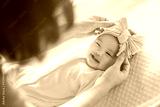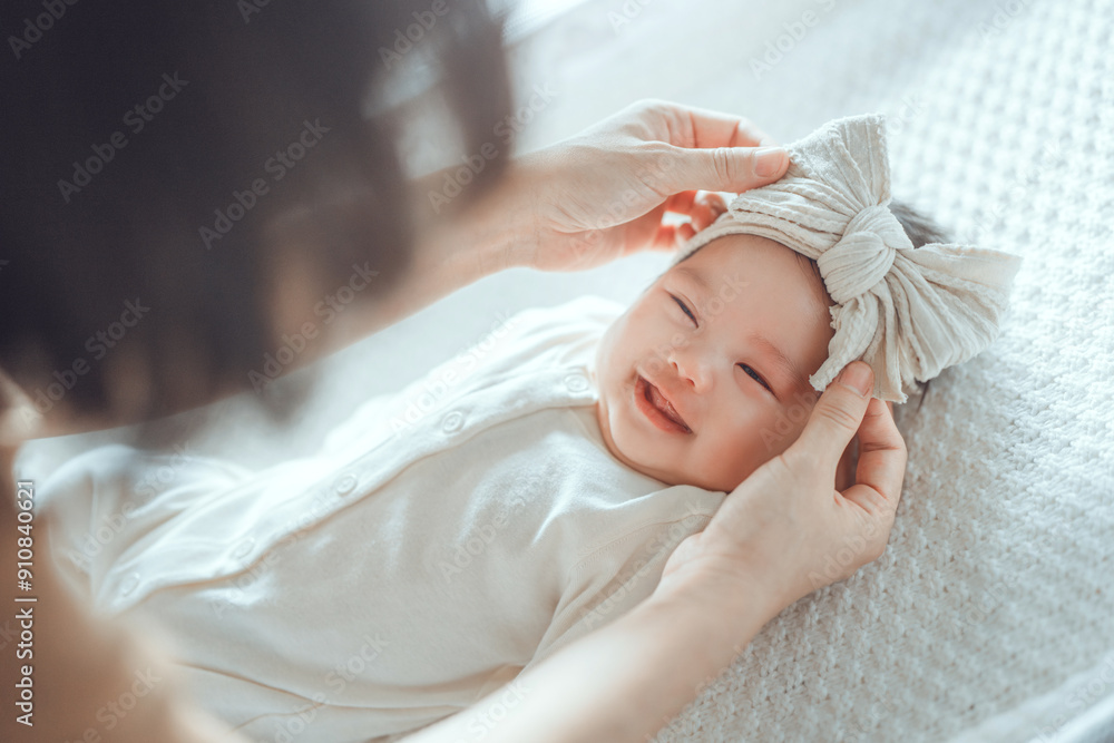 Happy excited baby newborn laughing at mom face, positive emotions, Mother wearing ribbon headband for her daughter, A happy family