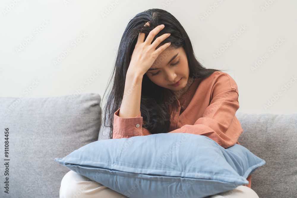 Sad, unhappy. Alone asian young woman, girl expression face thinking about problem, difficulty, feeling failure and exhausted, suffering from loneliness, grief sorrow and bad relationship or break up.