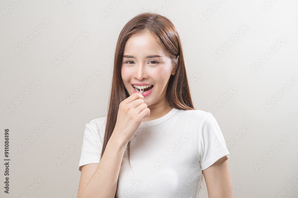 Flossing teeth, dental care hygiene, asian young woman flossing teeth with dental floss pick, smile happy with perfect white teeth, using tooth floss cleaning, healthy teeth isolated on background.