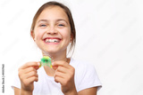 Kolorowy aparat ortodontyczny.Uśmiechnięta dziewczynka z kolorowym aparatem ortodontycznym