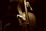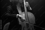 Cropped shot of unrecognizable male musician with long hair playing cello performing classical music on black background in dim lit recording studio