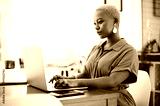 Typing, online and black woman with laptop, serious and thinking of ideas in office and copywriting. Writer, working and creative for website on desk, reading and confident in company and person