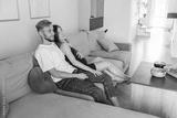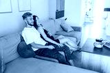 Pregnant Couple Relaxing on Sofa with Snacks.