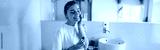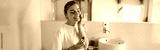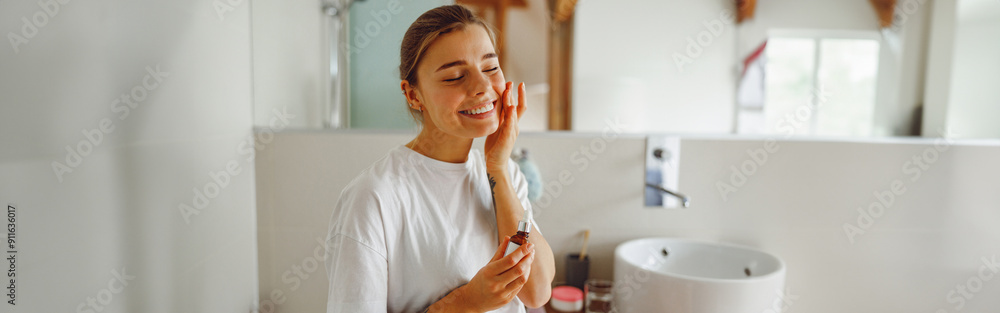 Beautiful young woman applying cosmetic serum onto her face in bathroom. Facial Skincare
