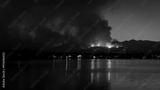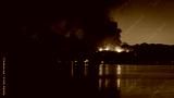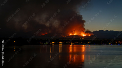 wildfire at Colorado foothills west of Loveland, smoke plume from Alexander Mountain fire as seen at sunset from Boyd Lake, July 29, 2024
