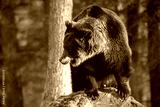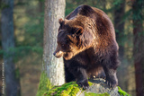 Majestic Brown Bear Standing on Moss-Covered Rock in Forest. Ursus arctos