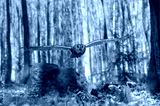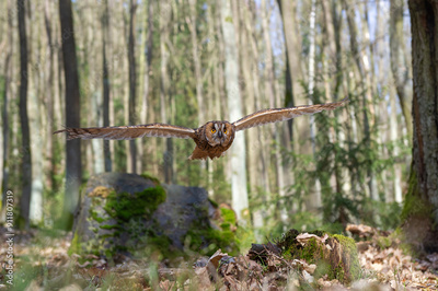 Long-eared owl Soaring Through Forest In Daylight. Asio otus