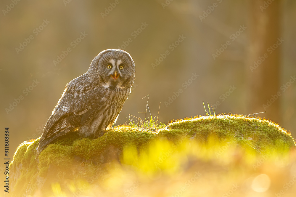 Great Grey Owl Perched on Mossy Rock in Sunlight