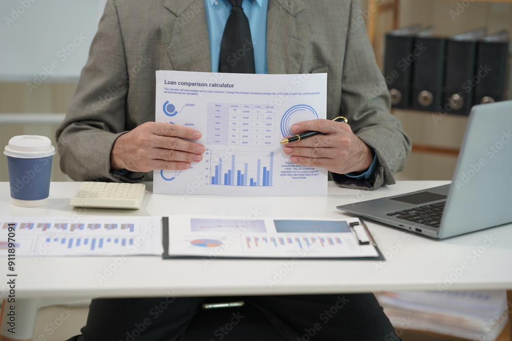 Businessman using calculator with laptop computer, budget and loan documents in office. Company auditor calculating budget with calculator on desk in office. Close up.
