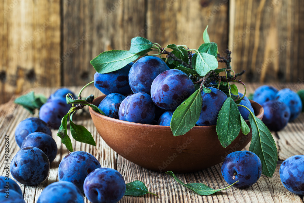 Fresh organic plums on rustic wooden table