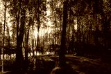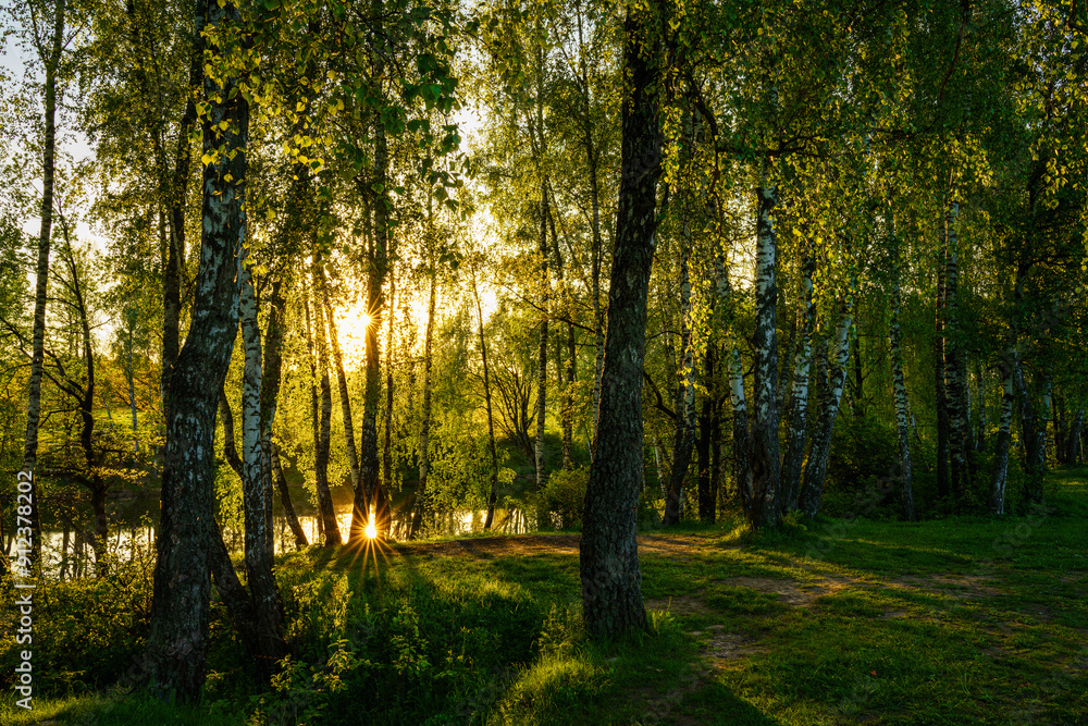 Sunrise or sunset near the pond with birches on a sunny summer day.