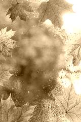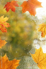 yellow and red leaves with raindrops on window with empty space inside. autumn background frame