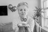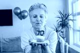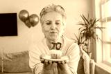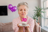 Elderly smiling cool happy woman 70s hold birthday cake with candle