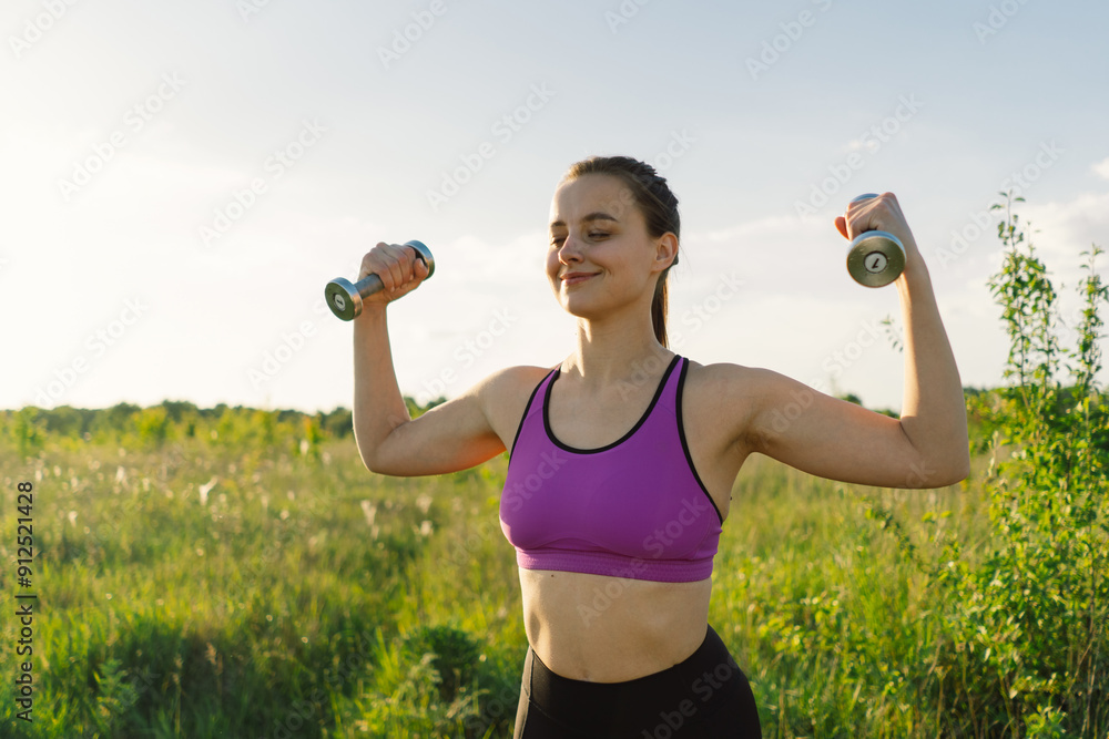 Beautiful girl doing fitness or yoga in nature on a sunny summer sunset.