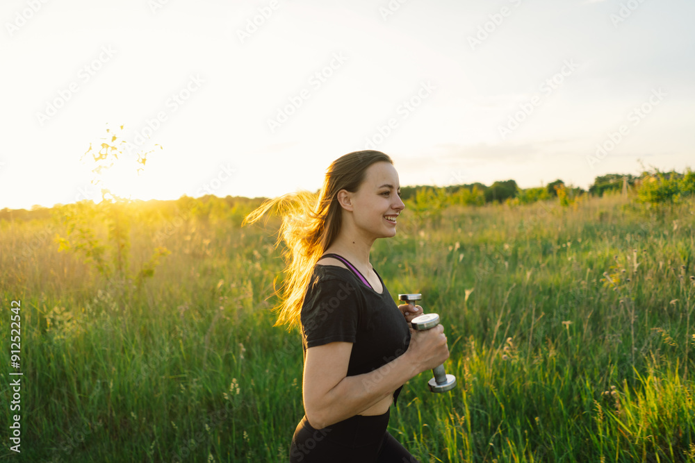 Beautiful girl doing fitness or yoga in nature on a sunny summer sunset.