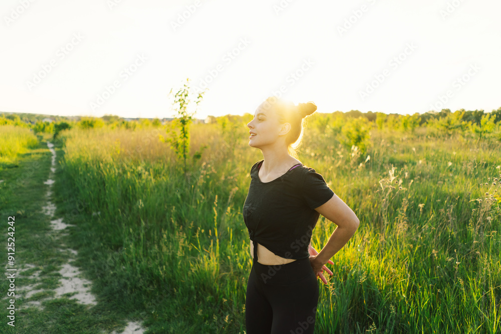 Beautiful girl doing fitness or yoga in nature on a sunny summer sunset.