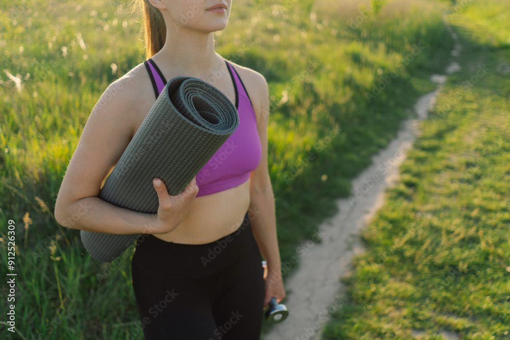 Beautiful girl doing fitness or yoga in nature on a sunny summer sunset.