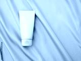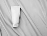 A Minimalist White Cosmetic Tube Positioned Gracefully on a Soft Fabric Background