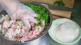 餃子の具材(キャベツ・にら・豚ひき肉)を混ぜる|餃子を作る イメージ