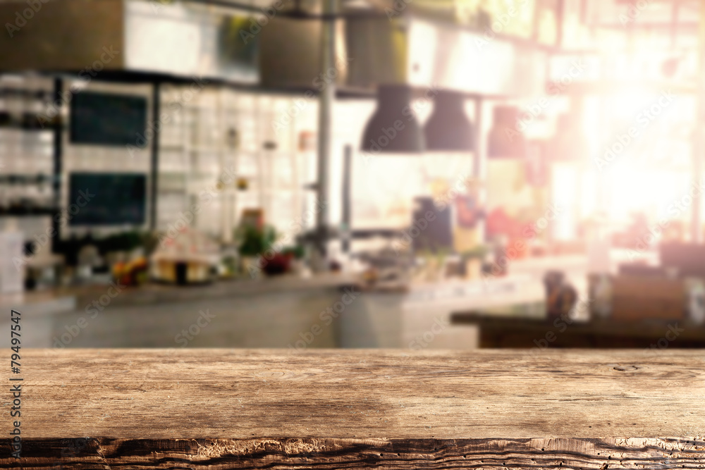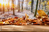 Autumn leaves on wooden table with warm autumn sunlight and forest trees background. Copy space for products.