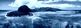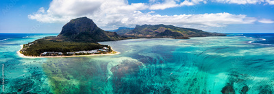 Aerial view of Mauritius island panorama and famous Le Morne Brabant mountain, beautiful blue lagoon and underwater waterfall. Le Morne Brabant peninsula and Underwater Waterfall, Mauritius.