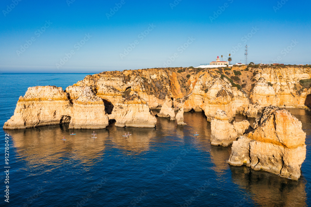 Panoramic view, Ponta da Piedade near Lagos in Algarve, Portugal. Cliff rocks and tourist boat on sea at Ponta da Piedade, Algarve region, Portugal. Ponta da Piedade, Algarve region, Portugal.