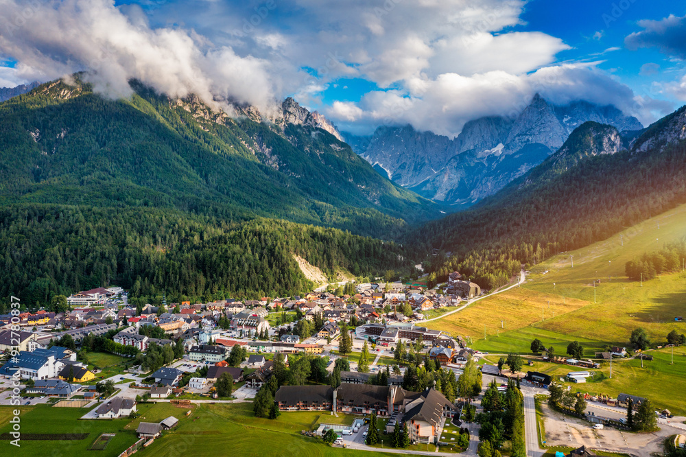 Kranjska Gora town in Slovenia at summer with beautiful nature and mountains in the background. View of mountain landscape next to Kranjska Gora in Slovenia, view from the top the town Kranjska Gora.