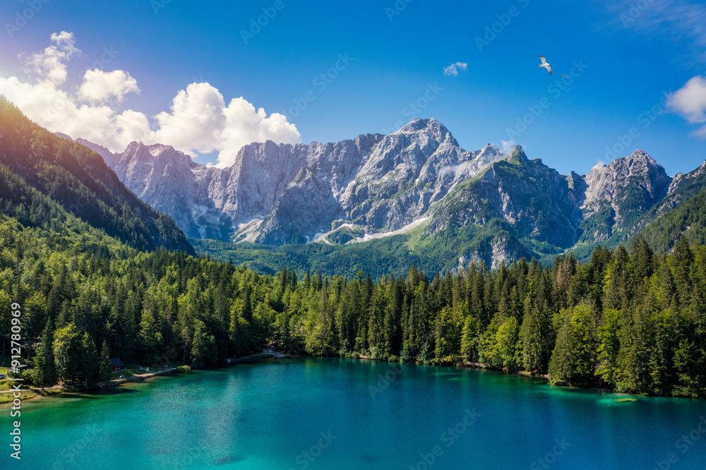 Picturesque lake Lago Fusine in Italy. Fusine lake with Mangart peak on background. Popular travel destination of Julian Alps. Location: Tarvisio comune , Province of Udine, Italy, Europe.