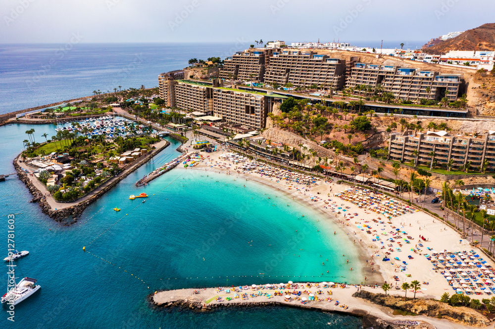 Aerial view with Anfi beach and resort, Gran Canaria, Spain. Playa Anfi del Mar, beautifull beach on Gran Canaria Island, Spain. Beach Anfi del Mar on Gran Canaria, Canary Islands, Spain.
