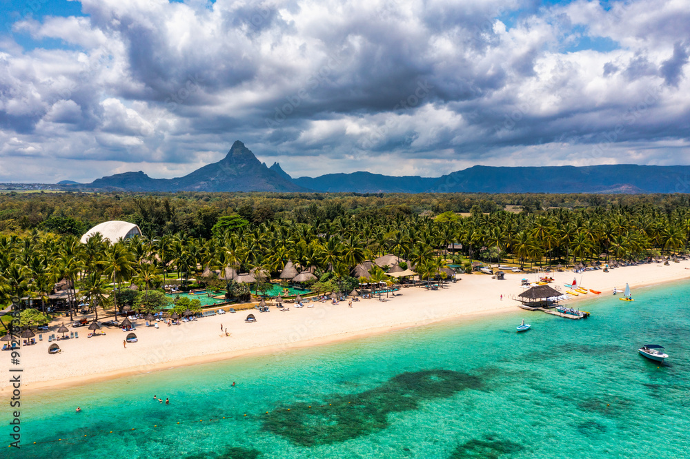 Beach of Flic en Flac with beautiful peaks in the background, Mauritius. Beautiful Mauritius Island with gorgeous beach Flic en Flac, aerial view from drone. Flic en Flac Beach, Mauritius Island.