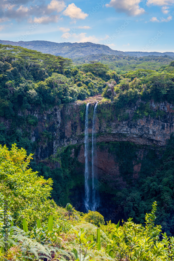 The highest waterfall on the island of Mauritius is Chamarel, whose water falls into the crater of a long-extinct volcano. Exotic nature of tropical paradise of Mauritius island, Chamarel waterfall.