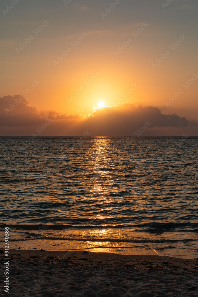 Dramatic colorful sunset sky over sea. Cloudscape nature background. Beautiful sunset over the sea. Sunset over the sea and beautiful cloudscape.