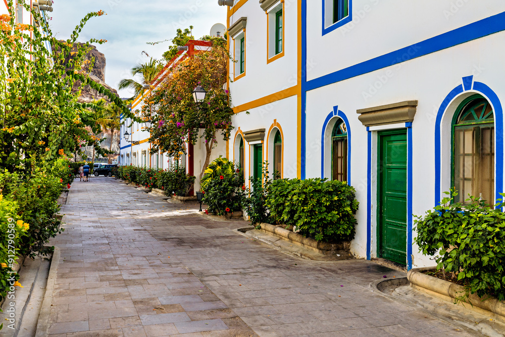 Street with blooming flowers in Puerto de Mogan, Gran Canaria, Spain. Favorite vacation place for tourists and locals on island. Puerto de Mogan with lots of bougainvillea flowers, Canary Island.