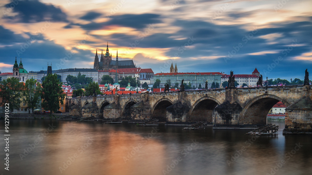 View of Prague Castle and Charles Bridge at sunset. Czechia