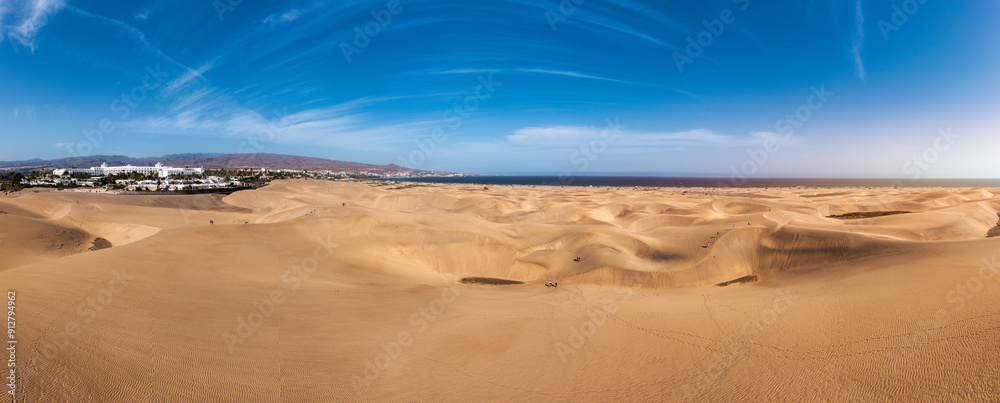 Landscape with Maspalomas town and golden sand dunes, Gran Canaria, Canary Islands, Spain. Natural Reserve of Dunes of Maspalomas, in Gran Canaria, Canary Islands, Spain.
