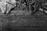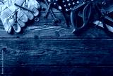A collection of tools on a rustic wooden background with an American flag. Concept for Labor Day in the USA