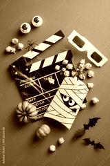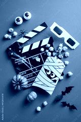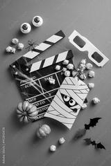 Creative Halloween movie night setup with popcorn, pumpkins, spooky decorations, and 3D glasses on a vertical purple background
