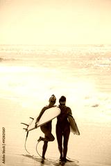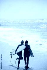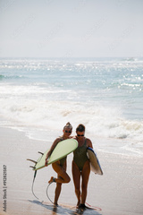 Two beautiful blondes in swimsuits pose with surfboards on the beach