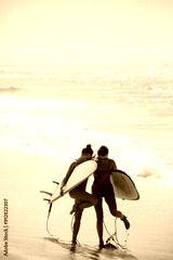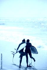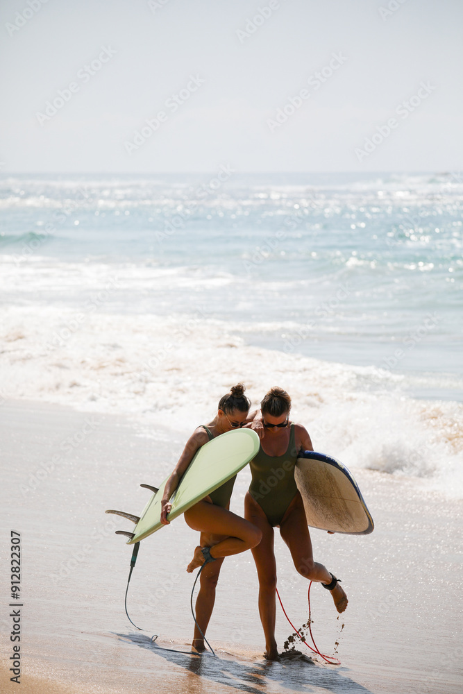 Two beautiful blondes in swimsuits pose with surfboards on the beach