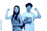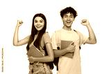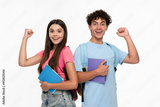 Happy overenjoyed winners high school pupils students teenagers classmates boy girl in casual with bag holding copybooks celebrating having success winning gesture isolated on white background.