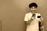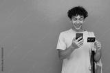 Happy excited boy guy high school male pupil student teenager with backpack holding credit bank plastic card and smart mobile cell phone using online banking app isolated on blue background copy space