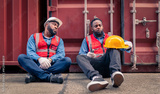 Two Engineer or foreman wears PPE sitting stress on container background in container storage with cargo container background at sunset. Logistics global import or export shipping industrial concept.