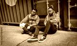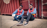 Two Engineer or foreman wears PPE sitting stress on container background in container storage with cargo container background at sunset. Logistics global import or export shipping industrial concept.