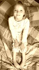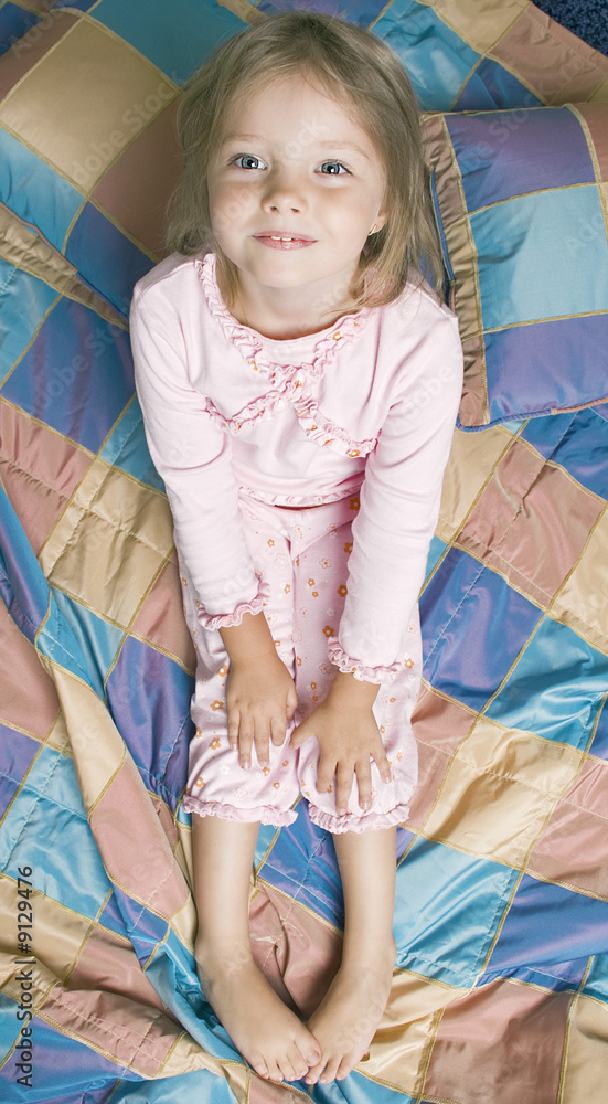 Little girl in pajamas sits on the bed and smiling. Top view.