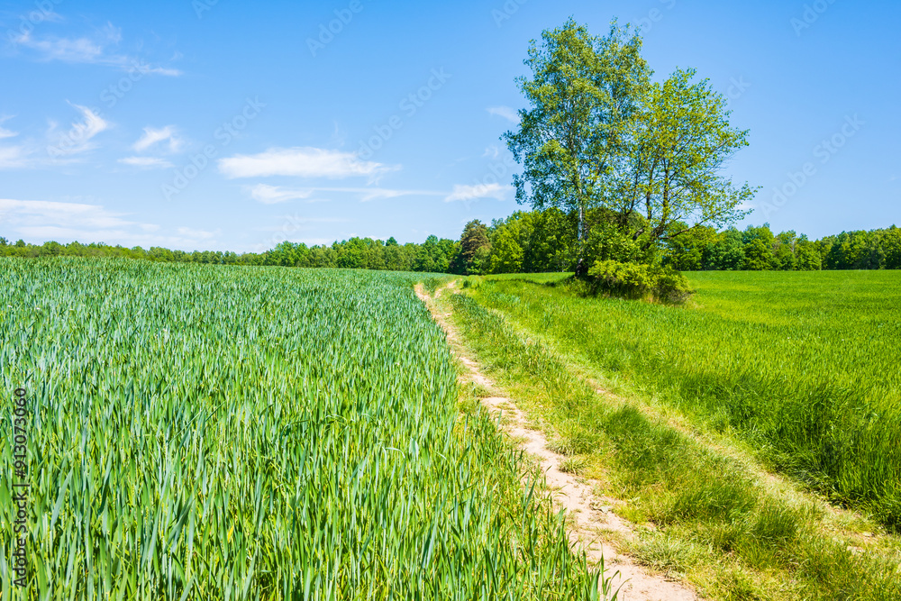 Rural road among green fields with yellow flowers in spring time, Milecice village, Lower Silesia, Poland