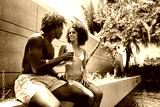 A young couple of African descent enjoying a sunny day at a luxurious poolside, sitting at the pool's edge with drinks in hand. A perfect vacation concept.