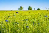 Flowers among green fields in late afternoon light in spring season near Milecice village, Lower Silesia, Poland