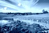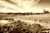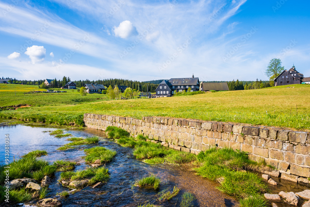 Jizerka river and green meadows in Jizerka village on sunny spring day, Jizera Mountains, Czech Republic