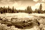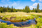 Jizerka river and green meadows with spruce trees in Jizerka village on sunny spring day, Jizera Mountains, Czech Republic
