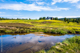 Jizerka river and green meadows with spruce trees in Jizerka village on sunny spring day, Jizera Mountains, Czech Republic